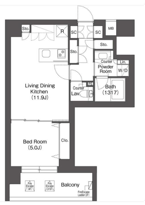 | 築年月 | 新築 | 間取り | 1LDK( LDK11.9畳/洋室5畳 ) | 専有面積 | 44.4m2 |